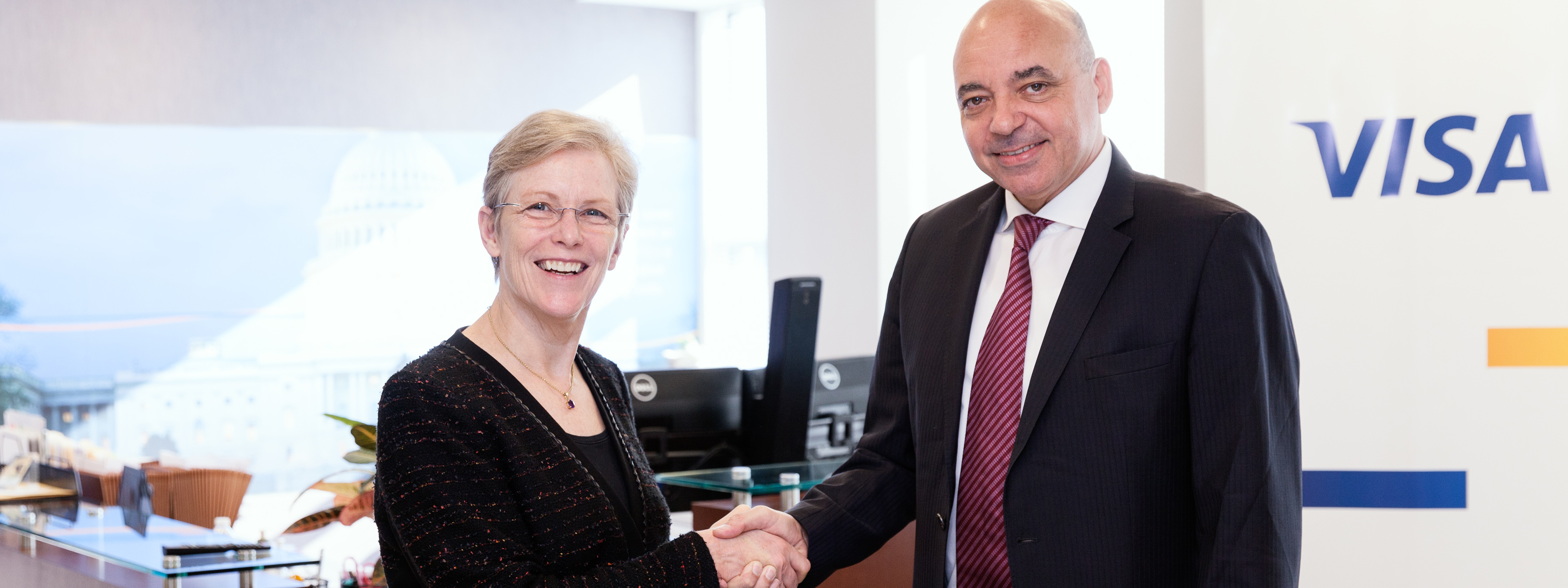 WASHINGTON, DC: The Alliance for Financial Inclusion (AFI) and Visa Inc., a global leader in the payments industry, have today signed a strategic partnership agreement that will enable close collaboration and knowledge exchange within the framework of AFI’s Public-Private Dialogue Platform (PPD). Taking part in the official signing ceremony was Visa Inc.’s Vice Chairman, Ellen Richey, and the Executive Director for AFI, Alfred Hannig.