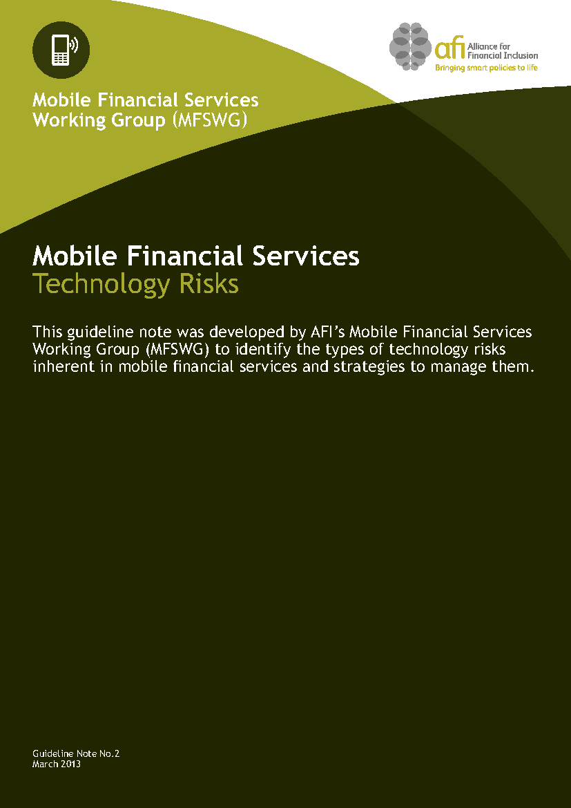 This guideline note was developed by AFI’s Mobile Financial Services Working Group (MFSWG) to identify the types of technology risks inherent in mobile financial services and strategies to manage them.