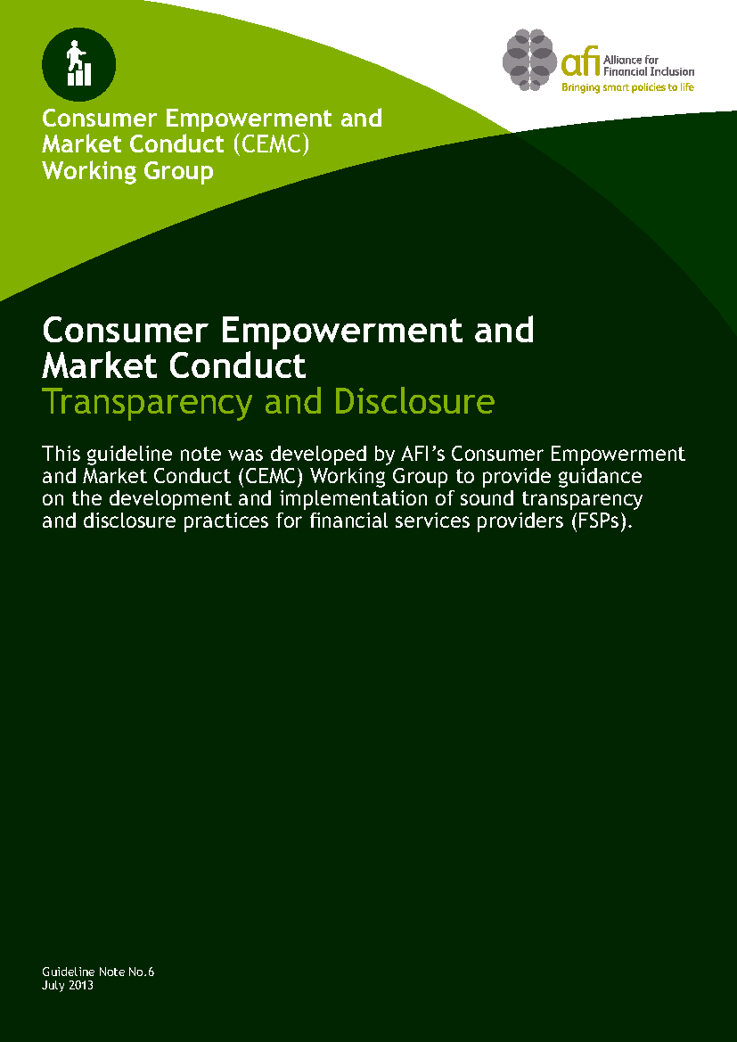 This guideline note was developed by AFI’s Consumer Empowerment and Market Conduct (CEMC) Working Group to provide guidance on the development and implementation of sound transparency and disclosure practices for financial services providers (FSPs).