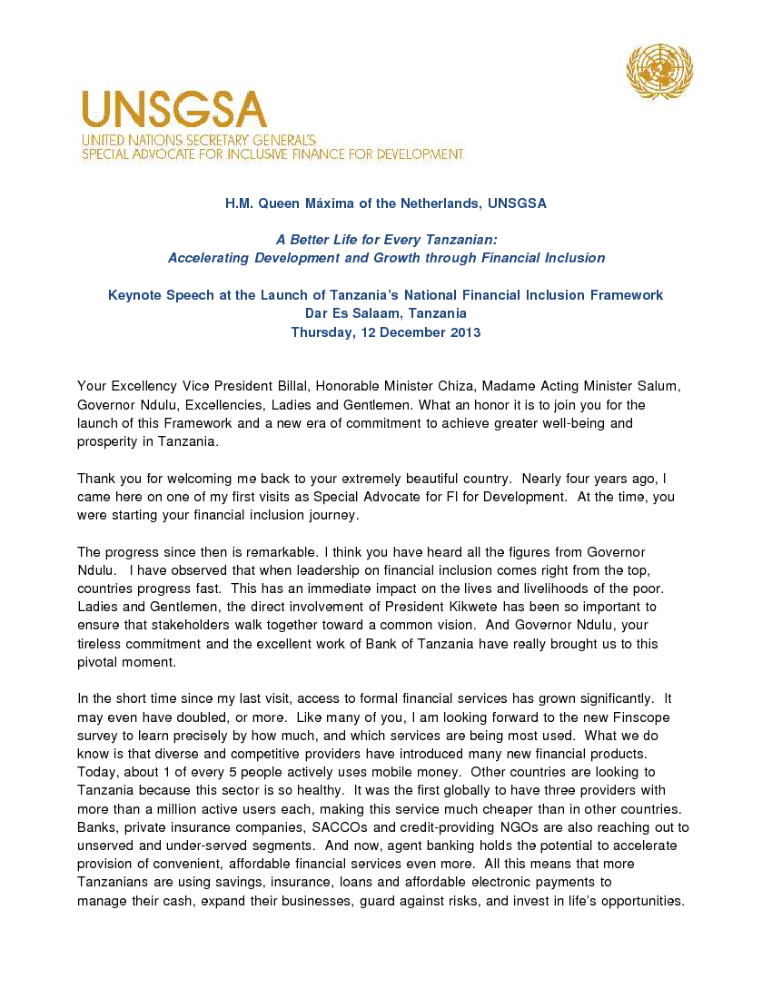 H.M. Queen Máxima of the Netherlands | Keynote speech at the Launch of the National Financial Inclusion Framework in Tanzania on 12 December 2013.