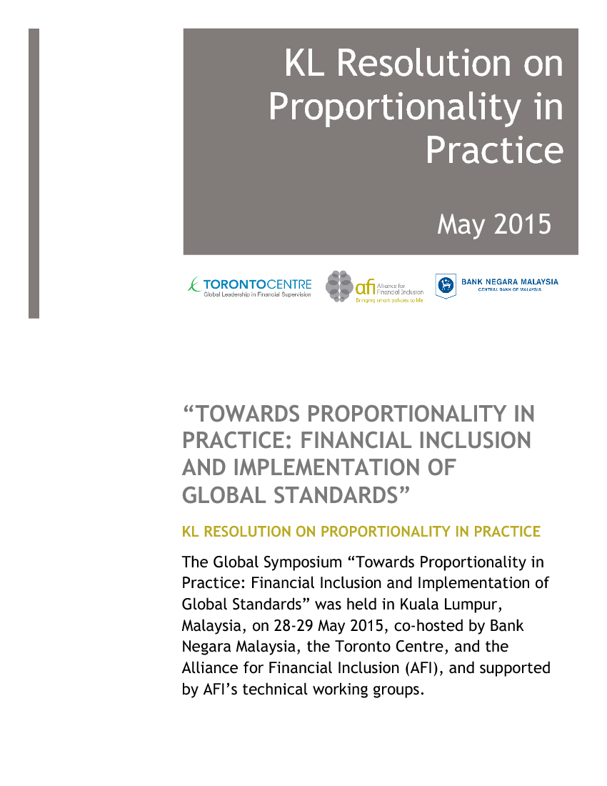The Global Symposium “Towards Proportionality in Practice: Financial Inclusion and Implementation of Global Standards” was held in Kuala Lumpur, Malaysia, on 28-29 May 2015, co-hosted by Bank Negara Malaysia, the Toronto Centre, and the Alliance for Financial Inclusion (AFI), and supported by AFI’s technical working groups.