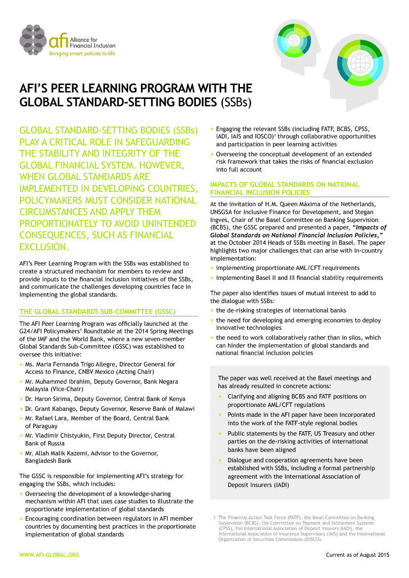 AFI’s Peer Learning Program with the SSBs was established to create a structured mechanism for members to review and provide inputs to the financial inclusion initiatives of the SSBs, and communicate the challenges developing countries face in implementing the global standards.