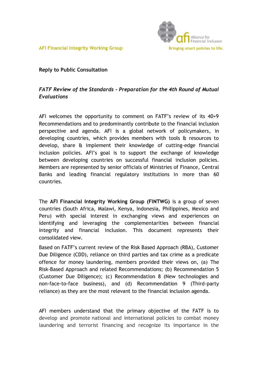 AFI welcomes the opportunity to comment on FATF’s review of its 40+9 Recommendations and to predominantly contribute to the financial inclusion perspective and agenda. AFI is a global network of policymakers, in developing countries, which provides members with tools & resources to develop, share & implement their knowledge of cutting-edge financial inclusion policies. AFI’s goal is to support the exchange of knowledge between developing countries on successful financial inclusion policies. Members are represented by senior officials of Ministries of Finance, Central Banks and leading financial regulatory institutions in more than 60 countries.