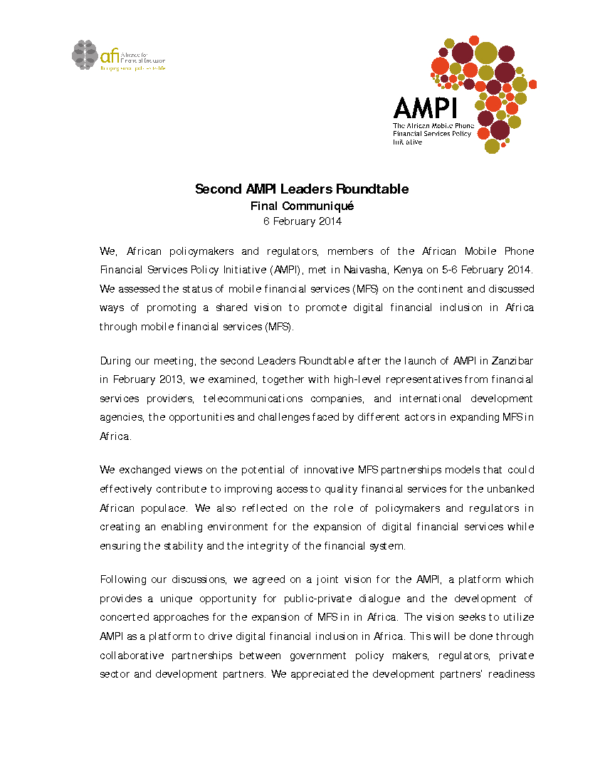 African policymakers and regulators, members of the African Mobile Phone Financial Services Policy Initiative (AMPI), met in Naivasha, Kenya on 5-6 February 2014.