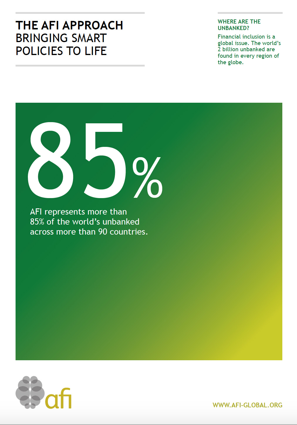 The Alliance for Financial Inclusion (AFI) is a peer-to-peer network that allows members to set their own agendas, harness each other’s knowledge and learn from each other. Using data, innovative tools and common principles, AFI provides a platform for members to translate their collective experience into practical knowledge and real solutions for sustainable and scalable financial inclusion.