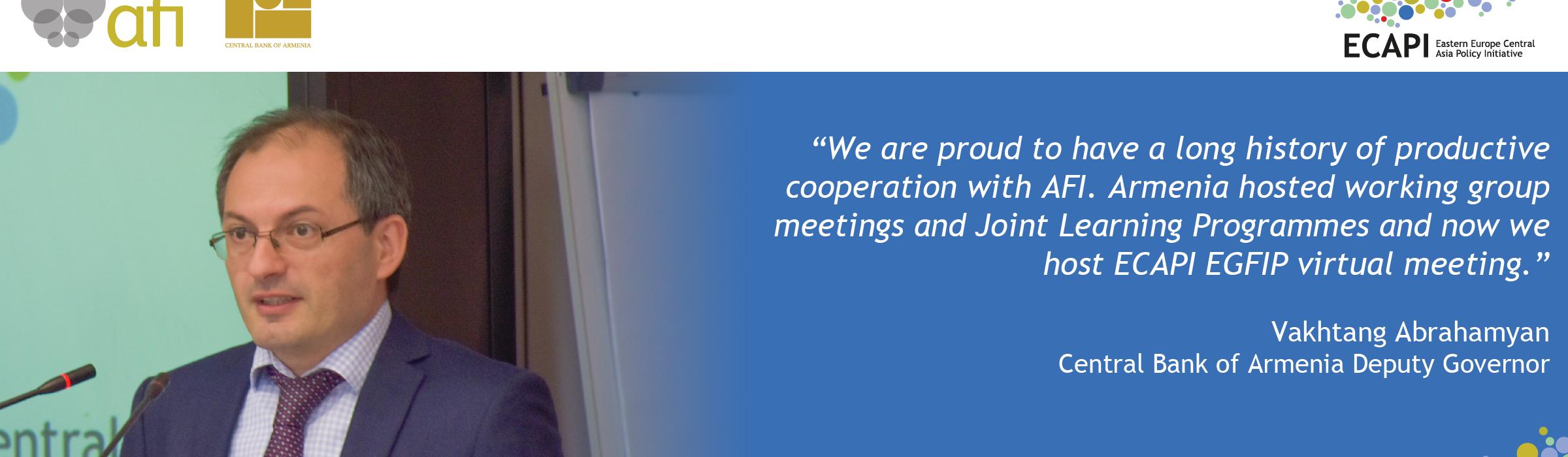 We are proud to have a long history of productive cooperation with AFI. Armenia hosted working group meetings and Joint Learning Programmes and now we host the ECAPI Experts Group on Financial Inclusion Policy (EGFIP) virtual meeting.