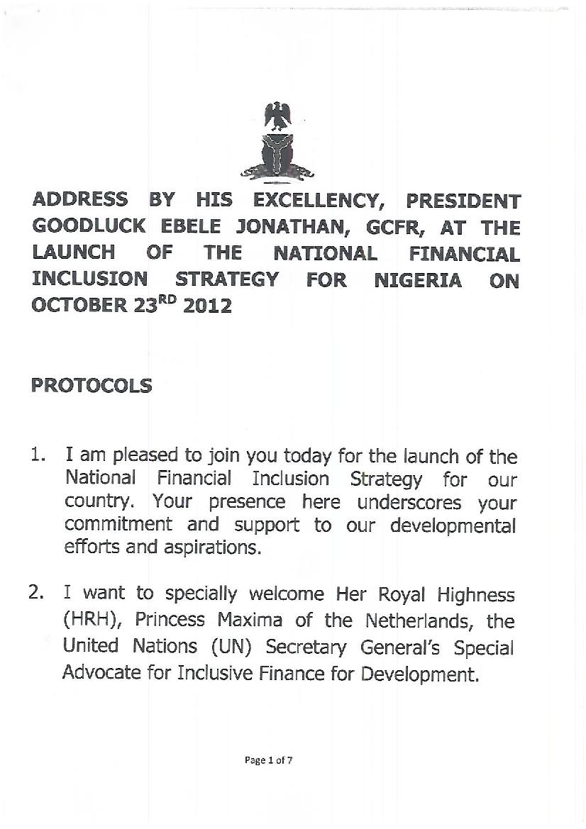 Address by President Goodluck Ebele Jonathan, GCFR, at Nigeria’s Launching of National Financial Inclusion Strategy
