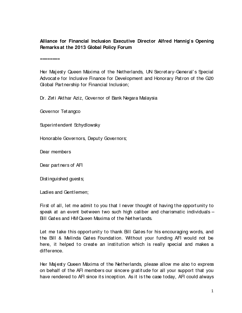 AFI E.D. Alfred Hannig’s Opening Remarks at the 2013 Global Policy Forum
