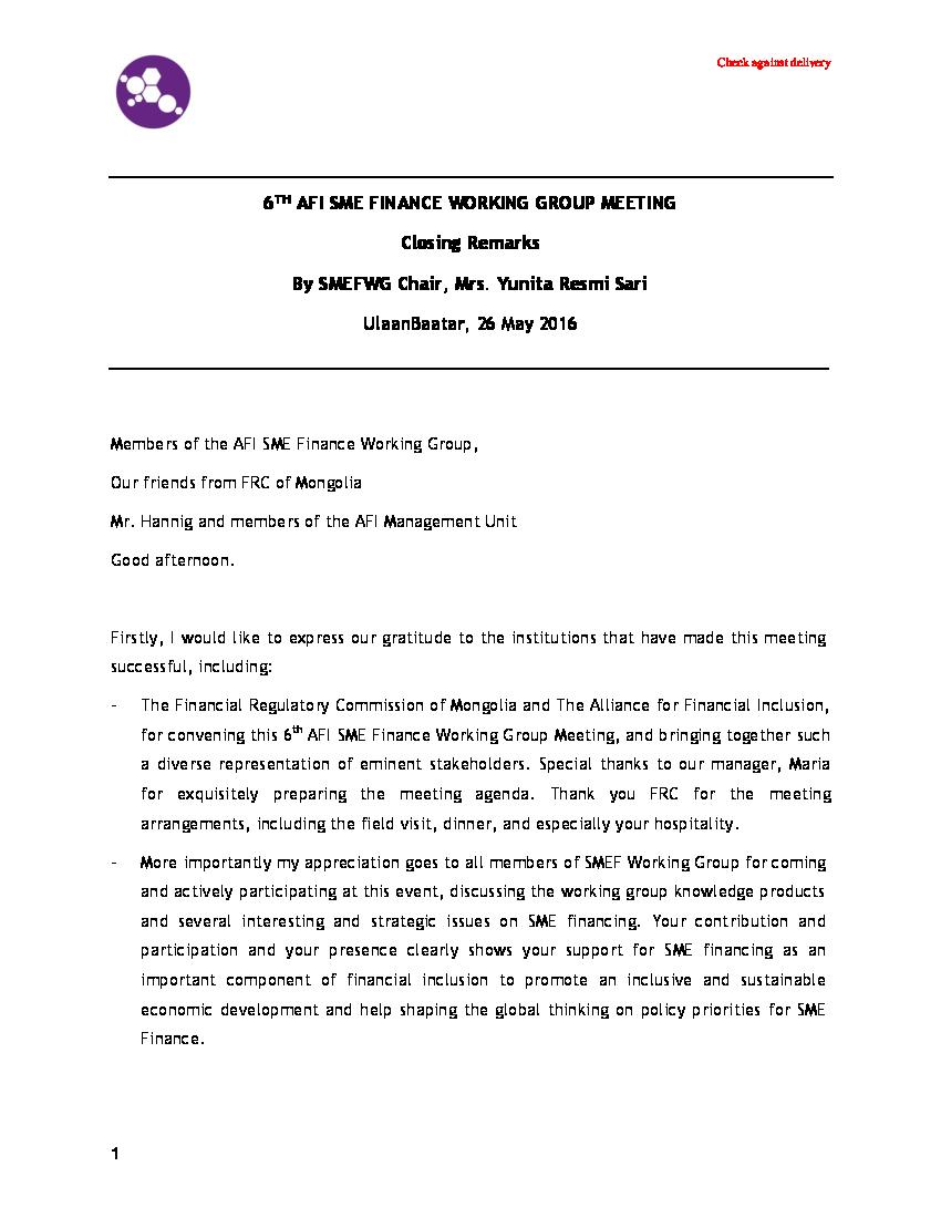6th AFI SME FINANCE WORKING GROUP MEETING — Closing Remarks By SMEFWG Chair, Mrs. Yunita Resmi Sari, Ulaanbaatar, 26 May 2016. Check quotes against delivery.
