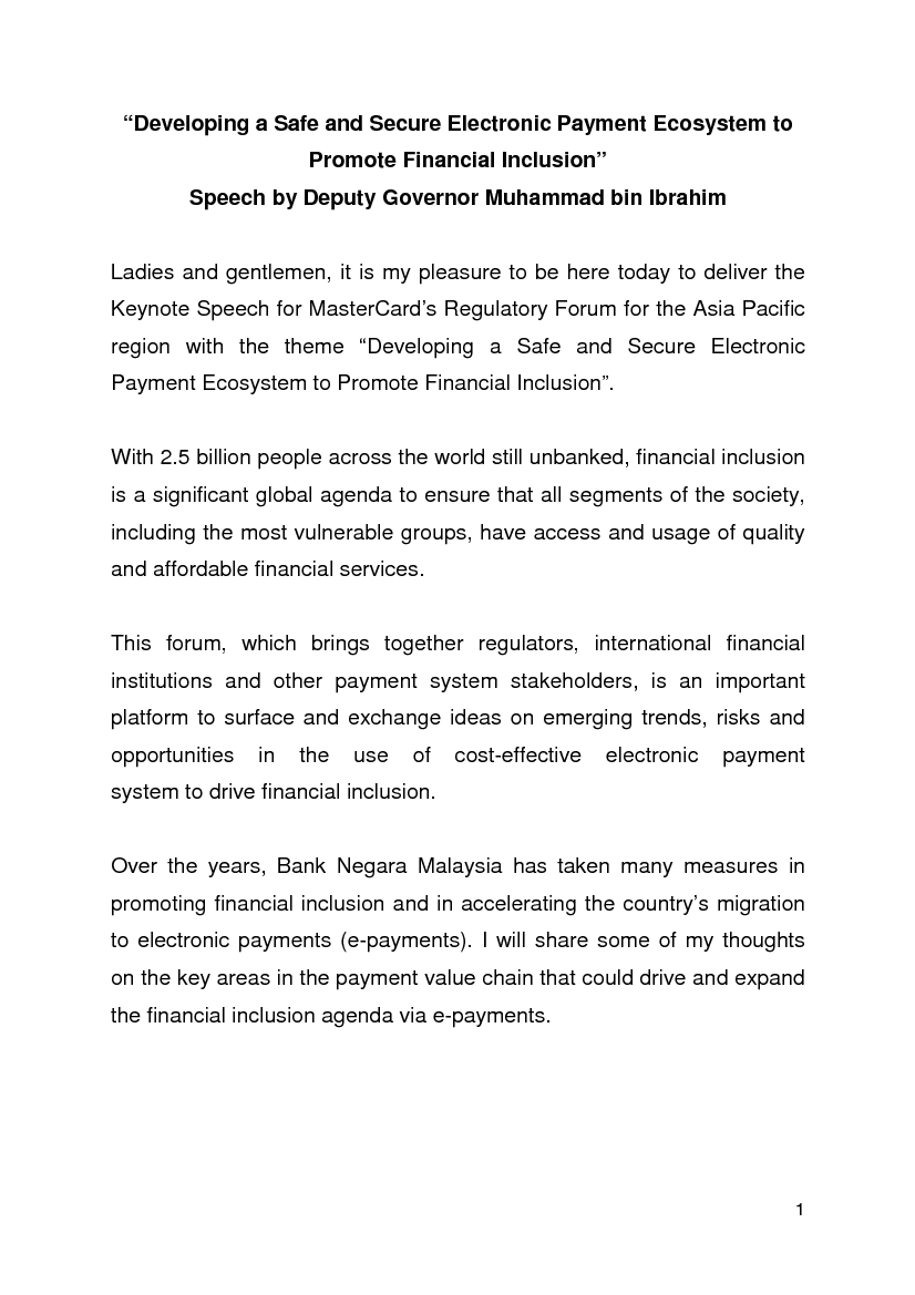 Keynote Speech by Bank Negara Malaysia (BNM) Deputy Governor Dato’ Muhammad bin Ibrahim for MasterCard’s Regulatory Forum for the Asia Pacific region with the theme “Developing a Safe and Secure Electronic Payment Ecosystem to Promote Financial Inclusion”.