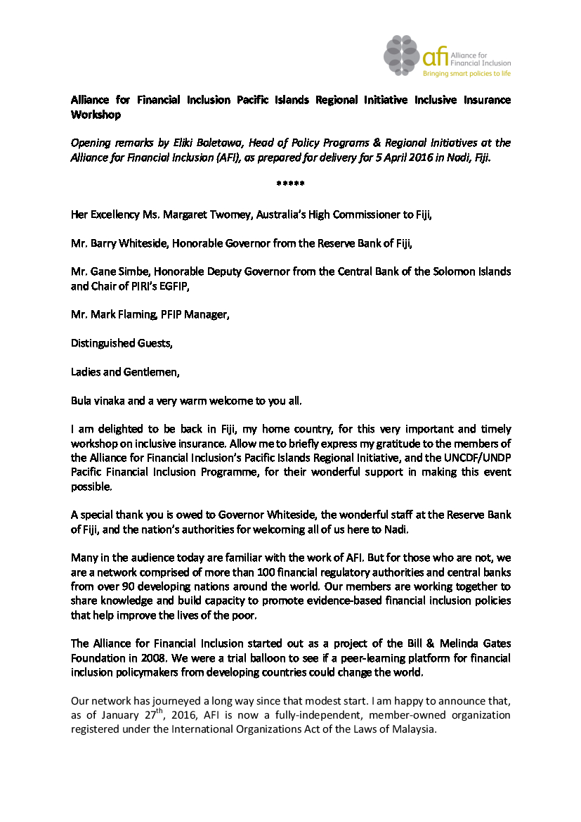 Opening remarks by Eliki Boletawa, Head of Policy Programs & Regional Initiatives at the Alliance for Financial Inclusion (AFI), as prepared for delivery for 5 April 2016 in Nadi, Fiji. Check quotes against delivery.