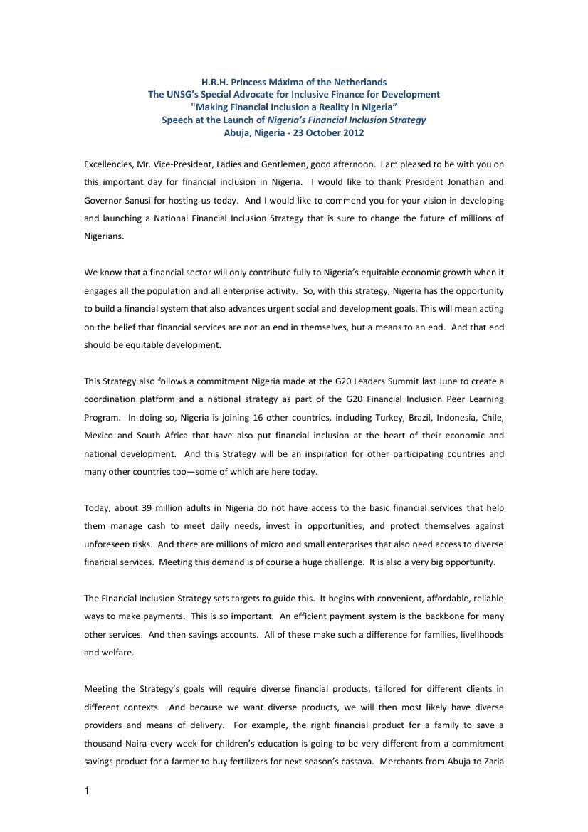 H.R.H. Princess Máxima of the Netherlands’, the UNSG’s Special Advocate for Inclusive Finance for Development, “Making Financial Inclusion a Reality in Nigeria” speech at the Launch of Nigeria’s Financial Inclusion Strategy in Abuja, Nigeria 23 October 2012.