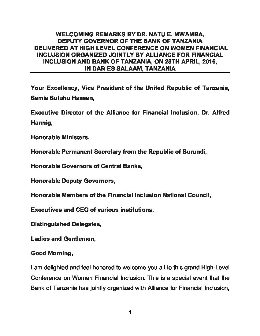 I am delighted and feel honored to welcome you all to this grand High-Level Conference on Women Financial Inclusion. This is a special event that the Bank of Tanzania has jointly organized with Alliance for Financial Inclusion, our partners in the quest to address the barriers that exclude the populace from accessing and using formal financial services.