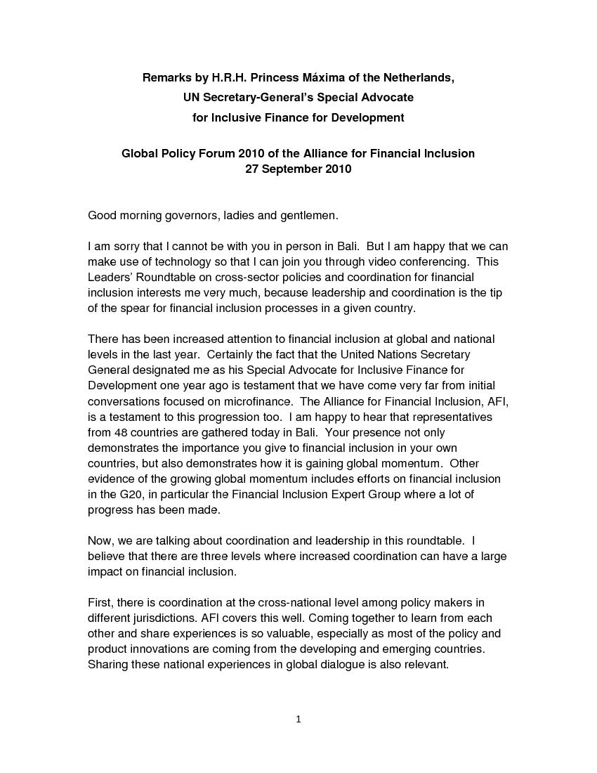 Remarks by H.R.H. Princess Máxima of the Netherlands at the 2010 Global Policy Forum