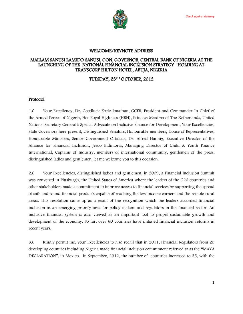 Welcome/Keynote Address by CBN Governor Mallam Sanusi Lamido Sanusi at the Launching of the National Financial Inclusion Strategy