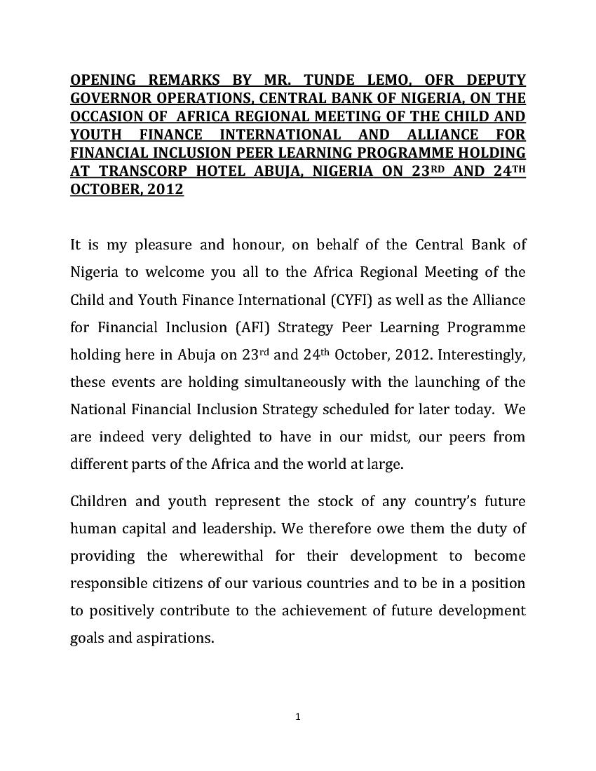 Welcome Remarks by CBN OFR Deputy Governor Operations Tunde Lemo at the Launching of the National Financial Inclusion Strategy