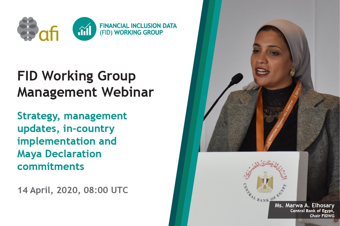 AFI is organizing a Virtual Meeting of the Financial Inclusion Data (FID) Working Group Management Webinar scheduled on 14th April 2020 at 08:00 AM (UTC). The webinar is organized for FID WG members only.