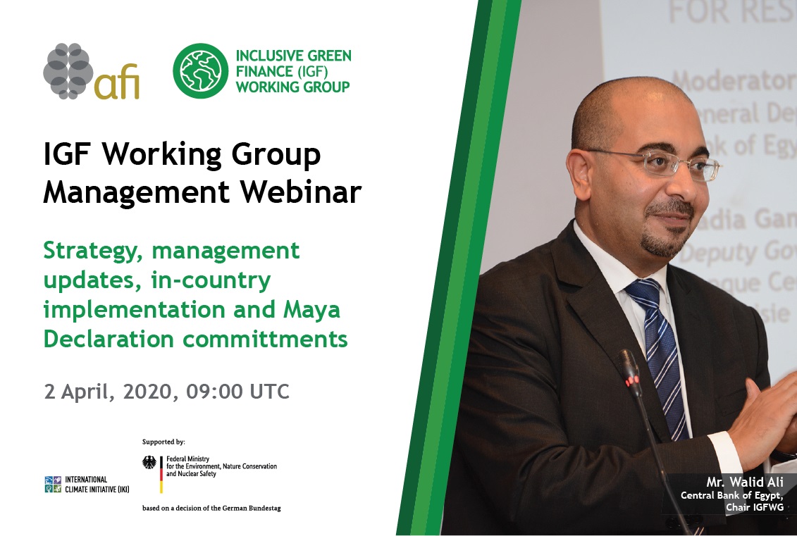 AFI is organizing first Inclusive Green Finance Working Group (IGF WG) Webinar on 2 April 2020 at 9 AM UTC.
