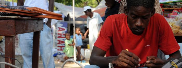 A man in Haiti fixes mobile phones. Photo credit: WikiCommons, by Stefan Krasowski from New York, NY, USA (Haiti Weekend 064)