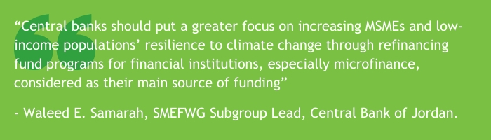 The survey found that financial regulators and policymakers are beginning to link MSME financial inclusion and climate change in their national financial inclusion strategies (NFIS). Among notable examples are Central Bank of Jordan’s NFIS Microfinance Action Plan and the Reserve Bank of Fiji’s NFIS Plan, both of which explicitly include MSMEs in their respective sections on green financial services and products.