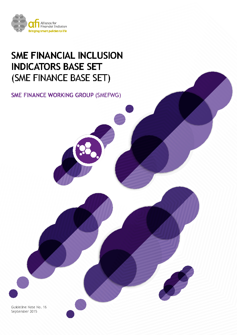 This guideline note on the SME Financial Inclusion Indicators Base Set (SME Finance Base Set) was developed by AFI’s SME Finance Working Group (SMEFWG) in consultation with the Financial Inclusion Data Working Group (FIDWG). The Base Set is intended to serve as a tool for measuring the access, usage and quality of financial services for small and medium enterprises (SMEs) in different countries.