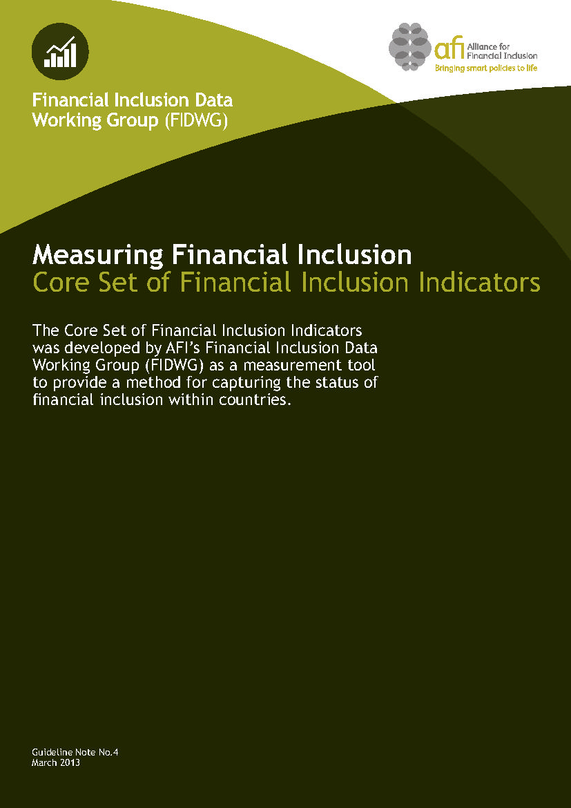 The Core Set of Financial Inclusion Indicators was developed by AFI’s Financial Inclusion Data Working Group (FIDWG) as a measurement tool to provide a method for capturing the status of financial inclusion within countries.