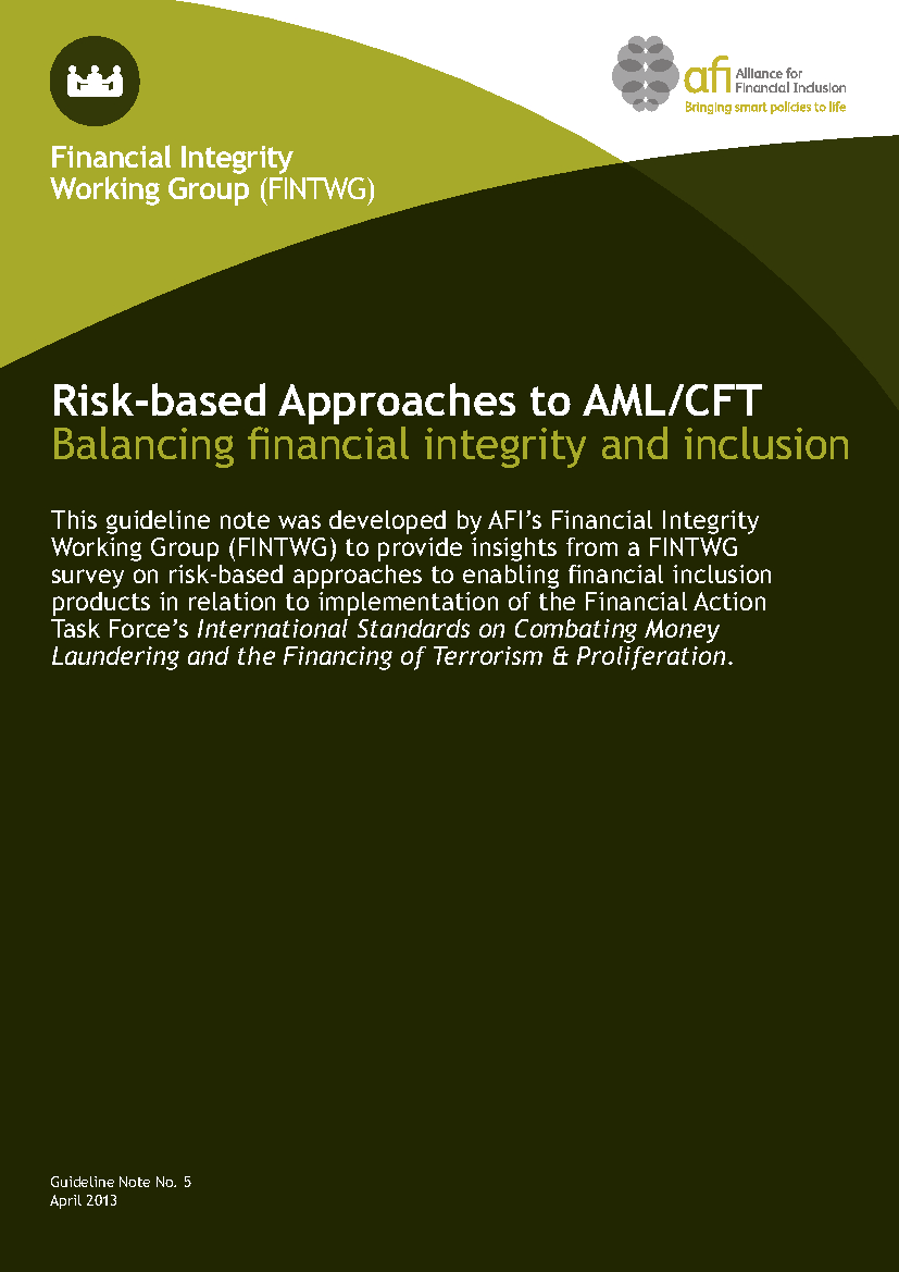 This guideline note was developed by the Alliance for Financial Inclusion’s (AFI) Financial Integrity Working Group (FINTWG) to provide insights from a FINTWG survey on risk-based approaches to enabling financial inclusion products in relation to implementation of the Financial Action Task Force’s International Standards on Combating Money Laundering and the Financing of Terrorism and Proliferation.