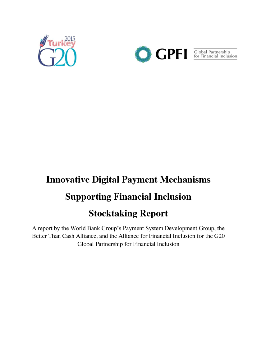 The purpose of this report is to provide visibility into the business models and technologies behind innovative payment mechanisms that have the potential to increase financial inclusion, particularly in low-income markets. Although not all innovations examined in this report have been made with the unserved and underserved in mind, many of them can nonetheless be used to facilitate financial inclusion.