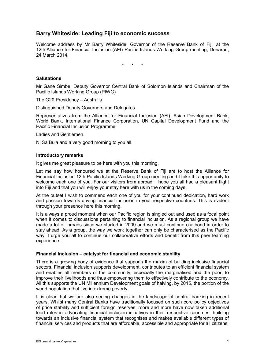 Welcome address by Mr. Barry Whiteside, Governor of the Reserve Bank of Fiji, at the 12th Alliance for Financial Inclusion (AFI) Pacific Islands Working Group (PIWG) meeting in March 2014.