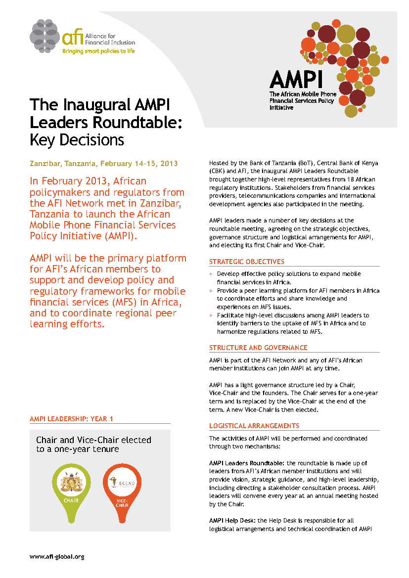 In February 2013, African policymakers and regulators from the AFI Network met in Zanzibar, Tanzania to launch the African Mobile Phone Financial Services Policy Initiative (AMPI).
