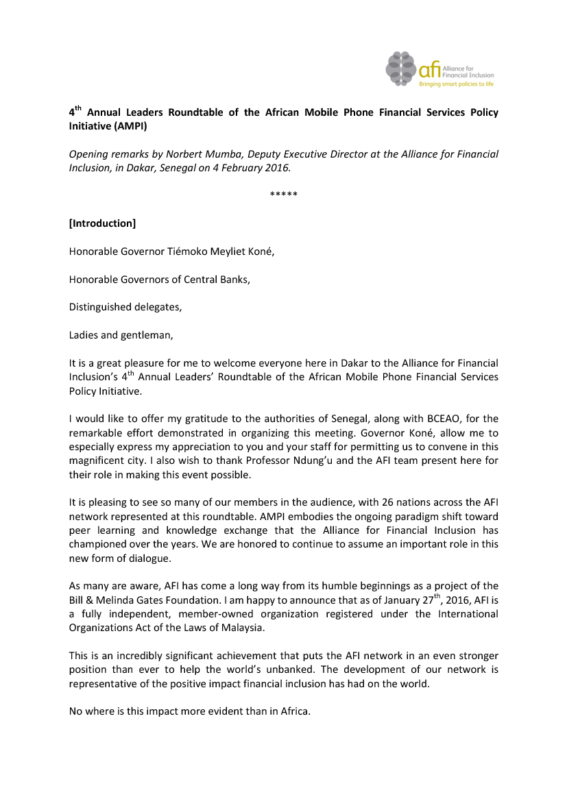 Opening remarks by Norbert Mumba, Deputy Executive Director at the Alliance for Financial Inclusion, in Dakar, Senegal on 4 February 2016. Check against delivery.