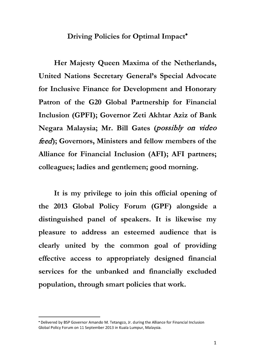 Bangko Sentral ng Pilipinas Gov. Amando Tetangco Jr. speech at 2013 GPF Opening Ceremony