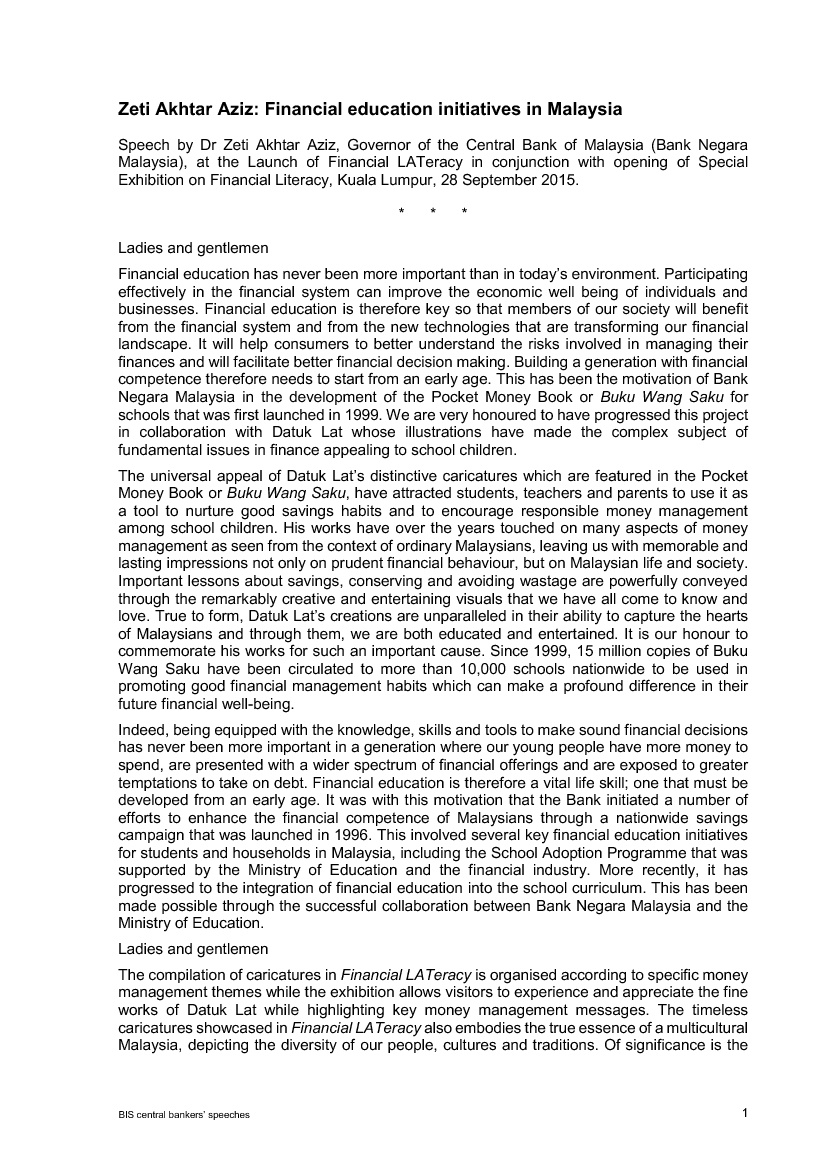 Speech by Dr. Zeti Akhtar Aziz, Governor of the Central Bank of Malaysia (Bank Negara Malaysia), at the Launch of Financial LATeracy in conjunction with opening of Special Exhibition on Financial Literacy, Kuala Lumpur, 28 September 2015.