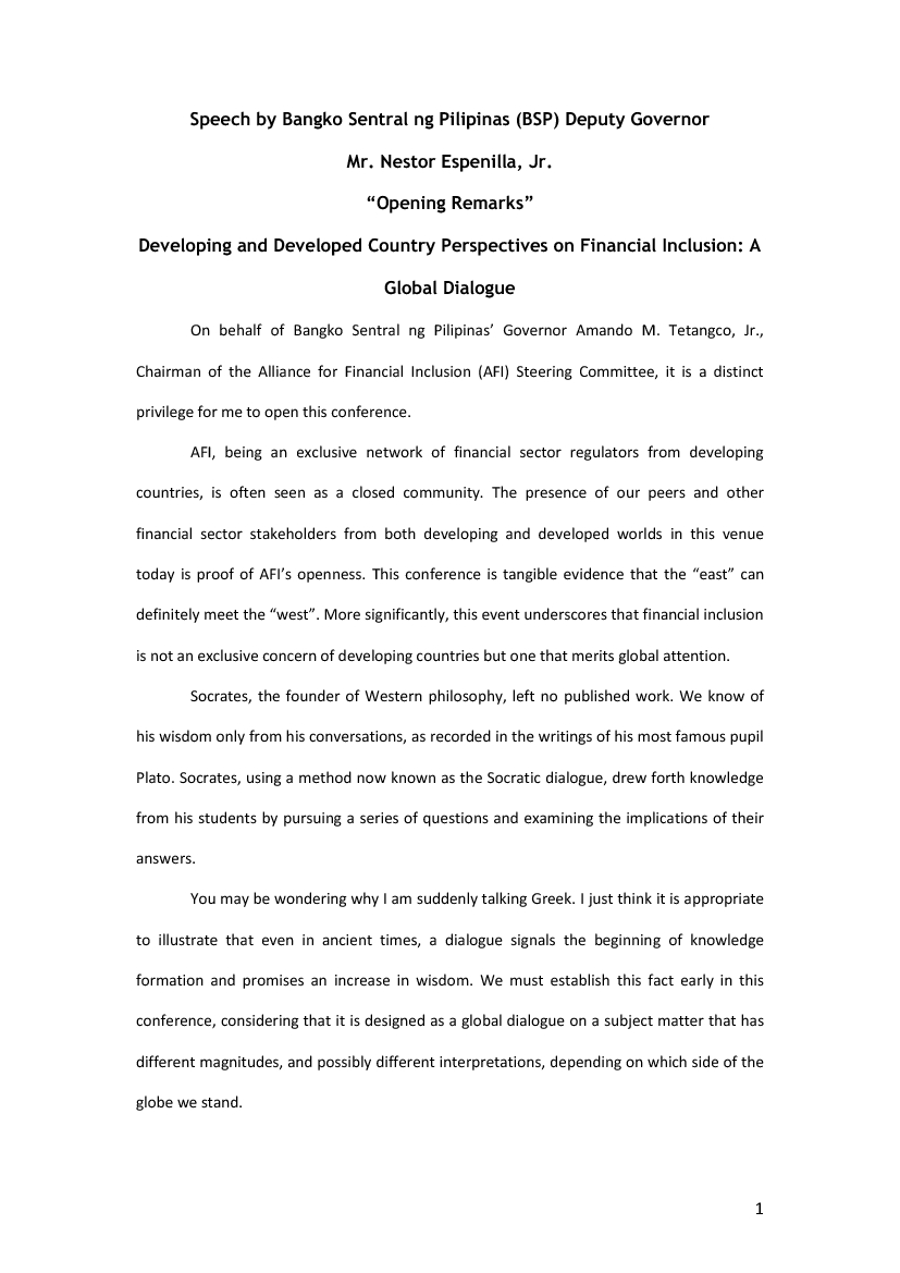 BSP Dep. Gov. Espenilla Jr.’s “Developing and Developed Country Perspectives on Financial Inclusion” Opening Remarks