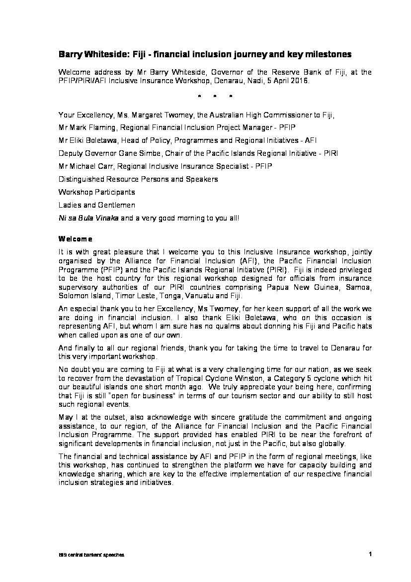 Welcome address by Mr Barry Whiteside, Governor of the Reserve Bank of Fiji, at the PFIP/PIRI/AFI Inclusive Insurance Workshop, Denarau, Nadi, 5 April 2016. Check quotes against delivery.