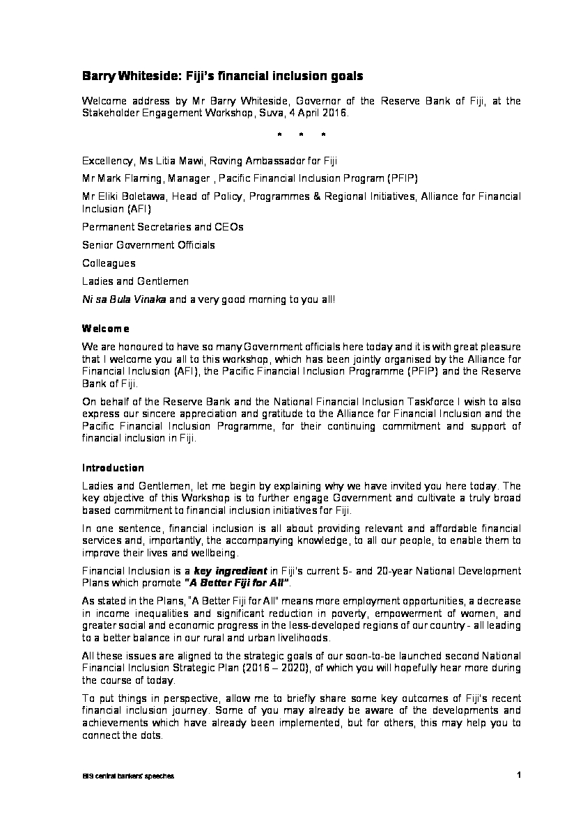 Welcome address by Mr Barry Whiteside, Governor of the Reserve Bank of Fiji, at the Stakeholder Engagement Workshop, Suva, 4 April 2016. Check quotes against delivery.